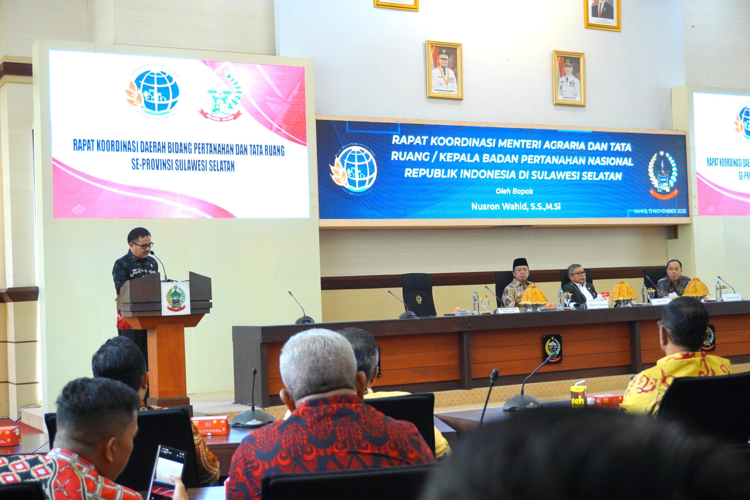 MAKASSAR—Bupati Luwu, H. Patahudding, menghadiri Kunjungan Kerja dan Rapat Koordinasi Menteri Agraria dan Tata Ruang/Kepala Badan Pertanahan Nasional Republik Indonesia, Nusron Wahid, S.S., M.Si, yang berlangsung di Ruang Rapat Pimpinan Kantor Gubernur Provinsi Sulawesi Selatan, Kamis (13/11/2025).