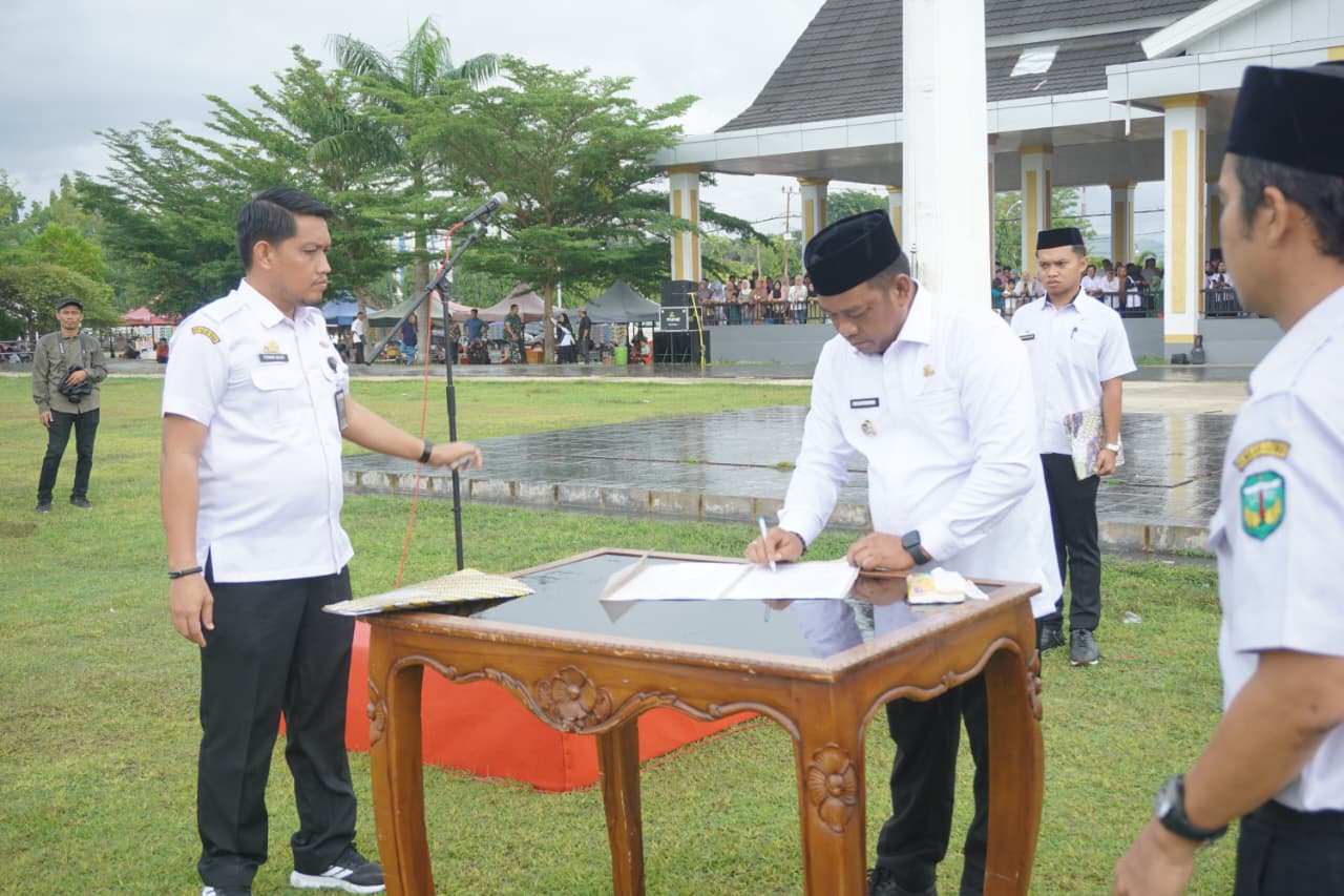 LUWU—Penyerahan Surat Keputusan (SK) Pengangkatan Pegawai Pemerintah dengan Perjanjian Kerja (PPPK) Paruh Waktu di lingkungan Pemerintah Kabupaten Luwu berlangsung khidmat meski diguyur hujan. SK tersebut diserahkan langsung oleh Bupati Luwu, Patahudding, di Lapangan Andi Djemma Belopa, Rabu (31/12/2025).