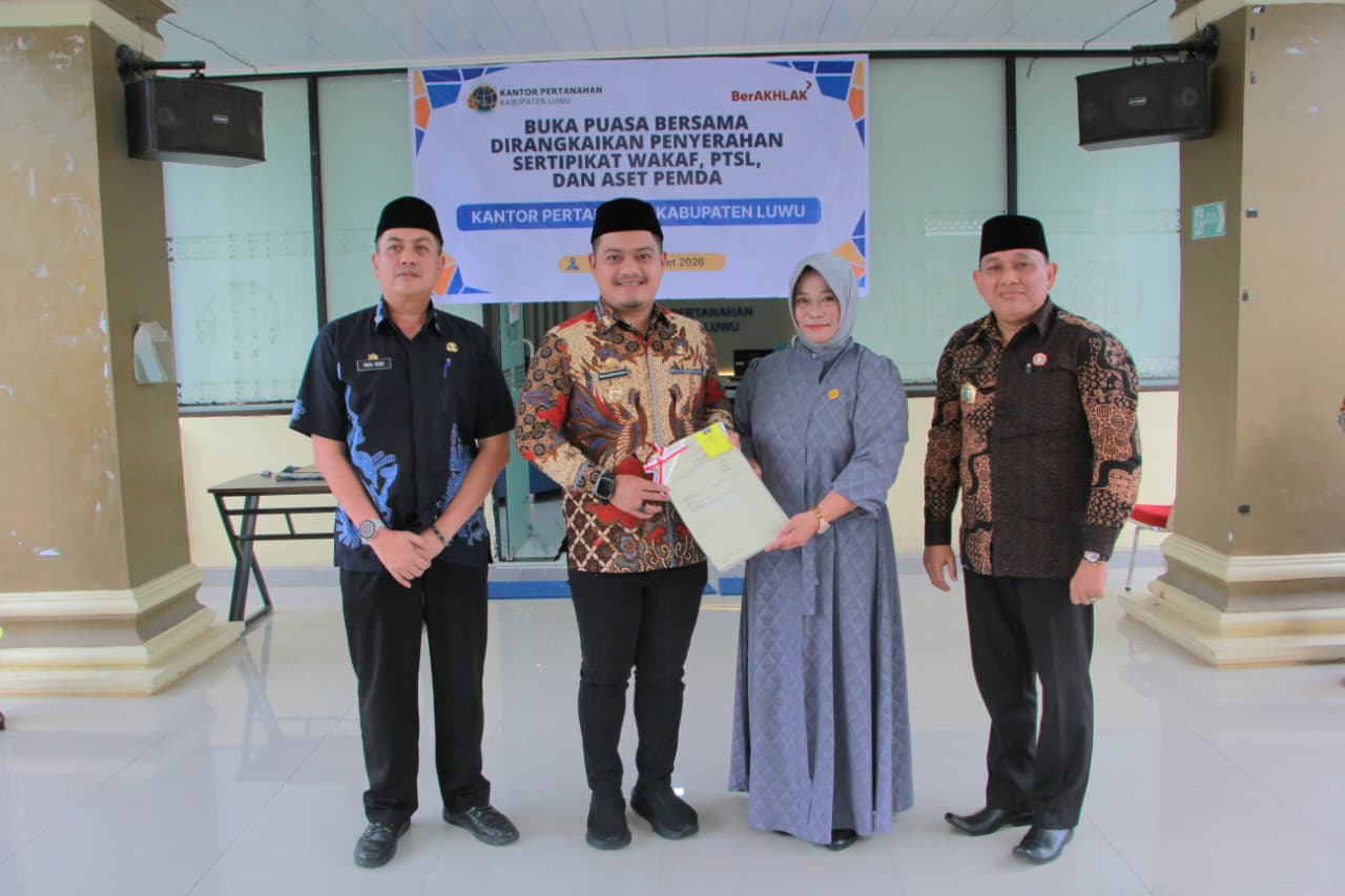 LUWU — Wakil Bupati Luwu, Muh. Dhevy Bijak Pawindu, menghadiri kegiatan buka puasa bersama yang dirangkaikan dengan penyerahan sertipikat wakaf, sertipikat Program Pendaftaran Tanah Sistematis Lengkap (PTSL), serta sertipikat aset milik Pemerintah Daerah. Kegiatan tersebut berlangsung di Kantor Pertanahan Kabupaten Luwu, Kamis (5/3/2026).
